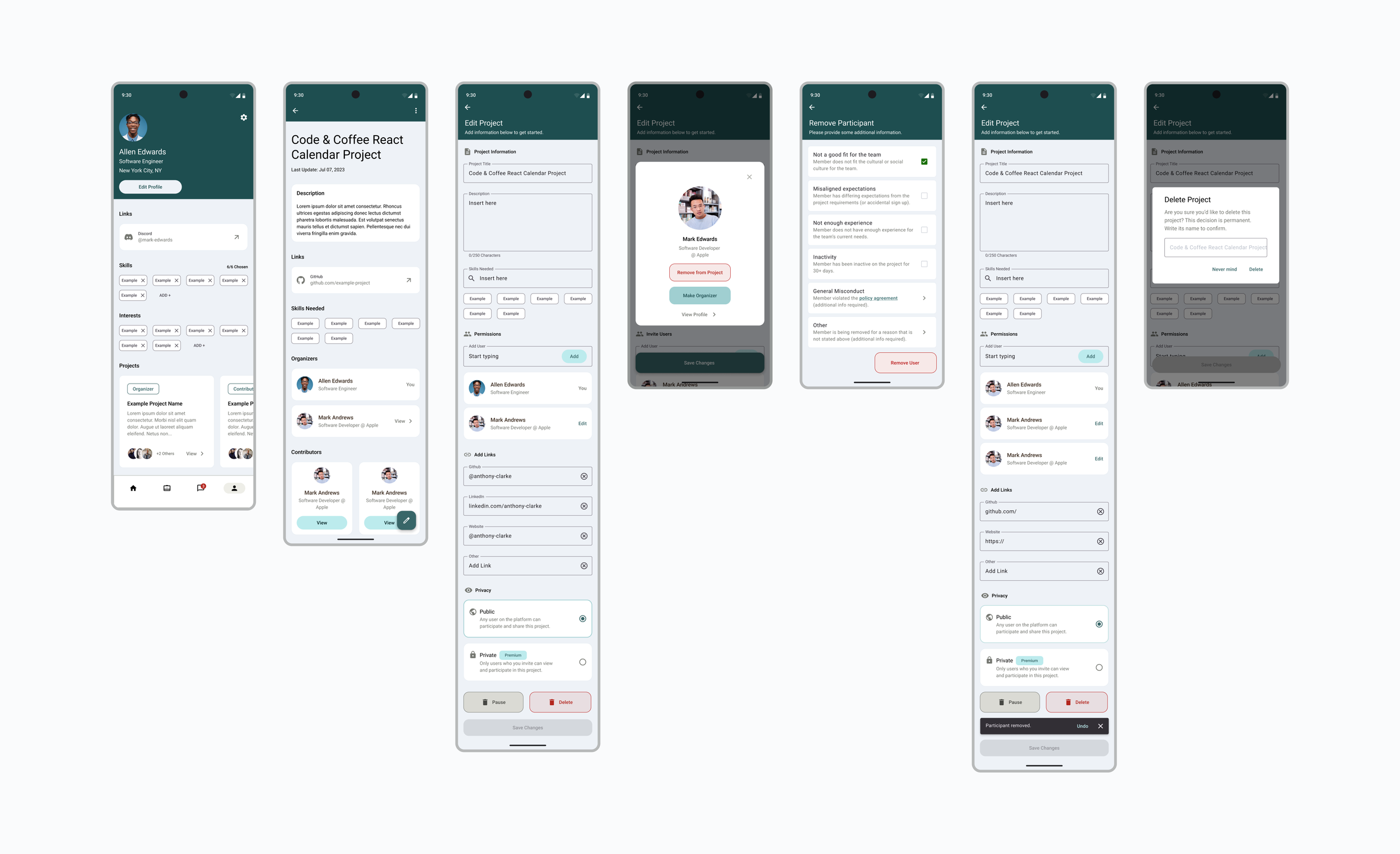 For organizers, editing project details and participants is an expected functionality for managing projects. I advocated for creating an additional confirmation screen while removing participants from a project by requiring organizers to identify why they are removing a user, and typing the name of the project to confirm deletion.